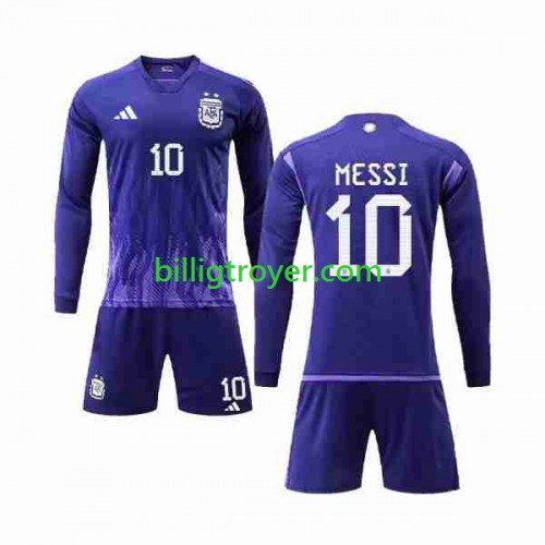 Billige Fotballdrakter Argentina 3 Stars Lionel Messi 10 Barn Bortedraktsett VM I Fotball 2022 Langermet